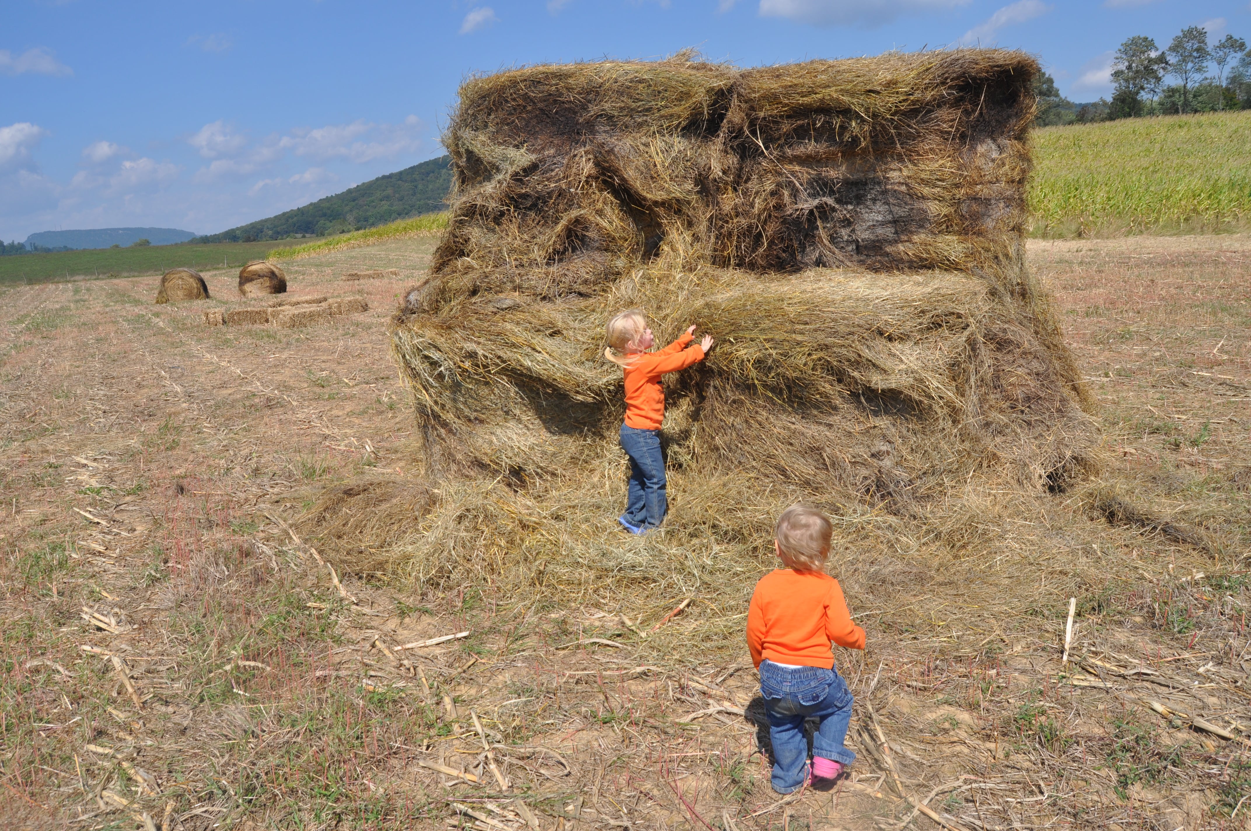I look up at the mountain and realize how flat our neighborhood is in comparison. I hear of insects from my childhood that I don't recall listening to from my own porch. I smell fall - really smell it. I show Miss Moo places that I played when I was a girl and give her my toys to use. I see Miss Roo clambering after her and recall chasing after my brother because he was so awesome.
